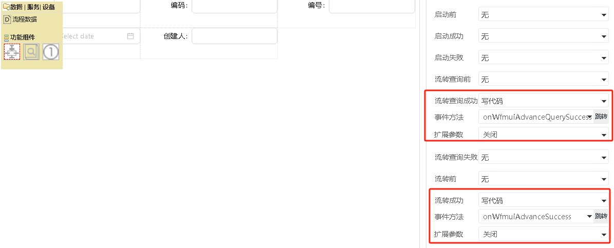 要判断是否最后一个人处理可以在页面的流程组件的“流程查询成功”或者“流程成功”事件写代码的方式判断,代码基本一样,如下: