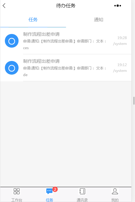 任务处理人进入移动端,有待办任务时,在导航栏中任务中会显示待办任务数