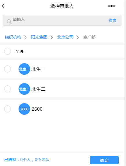 - 选择处理人:选择环节处理人,点击➕号,弹出组织选择对话框,进行筛选处理人