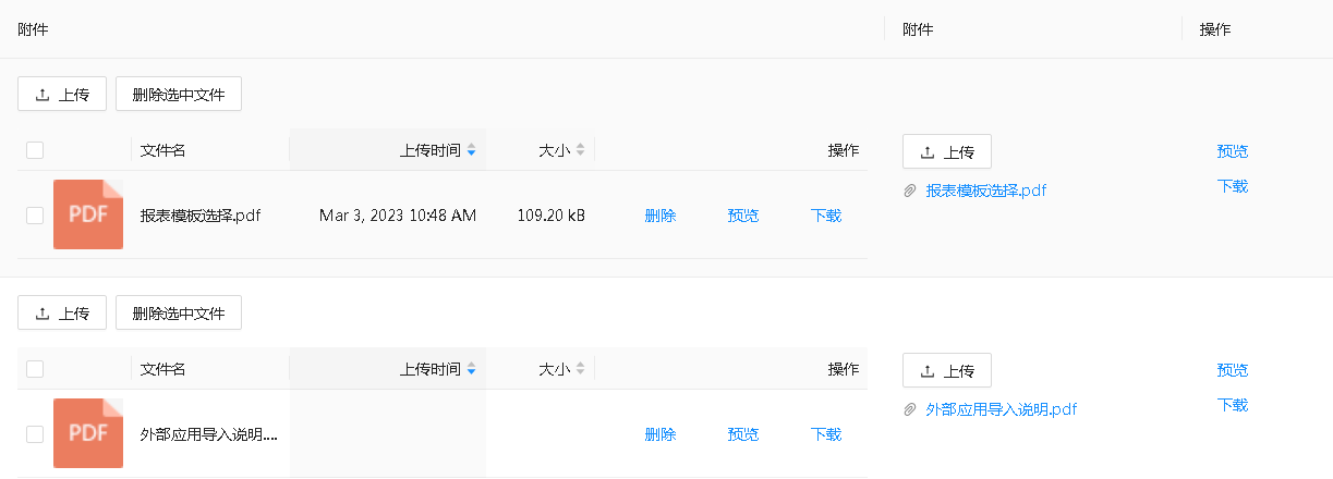 - 表格展示样式的附件组件,有预览和下载两个按钮,点击预览按钮触发附件组件的点击预览事件,点击下载按钮触发附件组件的下载事件