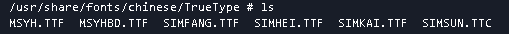 平台提供了六种字体,分别是微软雅黑、宋体、新宋体、仿宋、黑体和楷体。字体文件放在/usr/share/fonts/chinese/TrueType目录下。