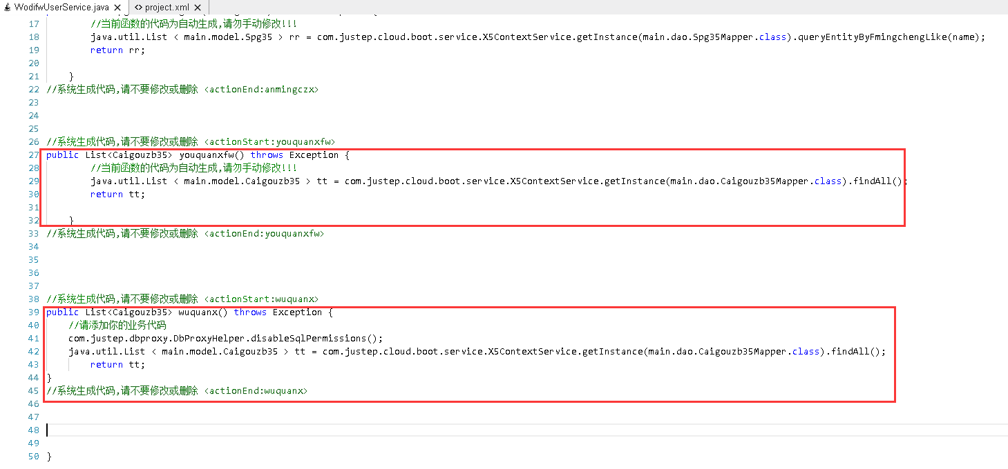 - 在代码页签中,/model/service/main/project.xml中添加如下代码