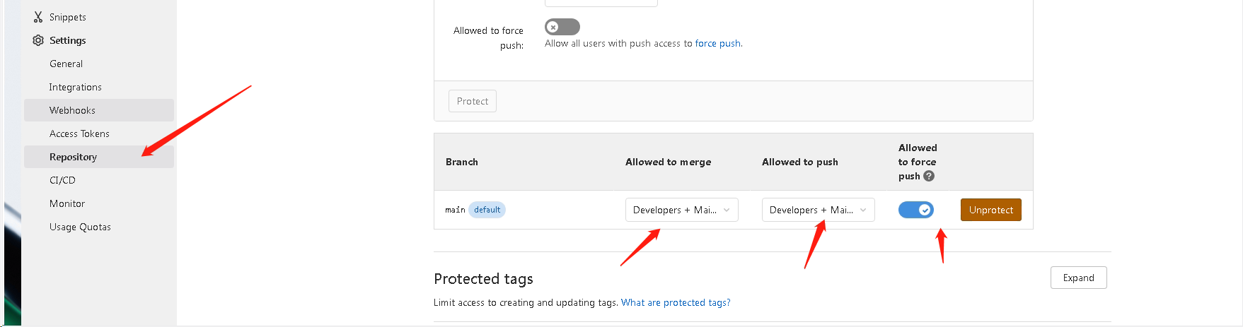 - gitlab 支持默认main分支,不管哪个分支,都要将仓库受保护分支允许合并、允许推送、允许强制推送策略及角色
