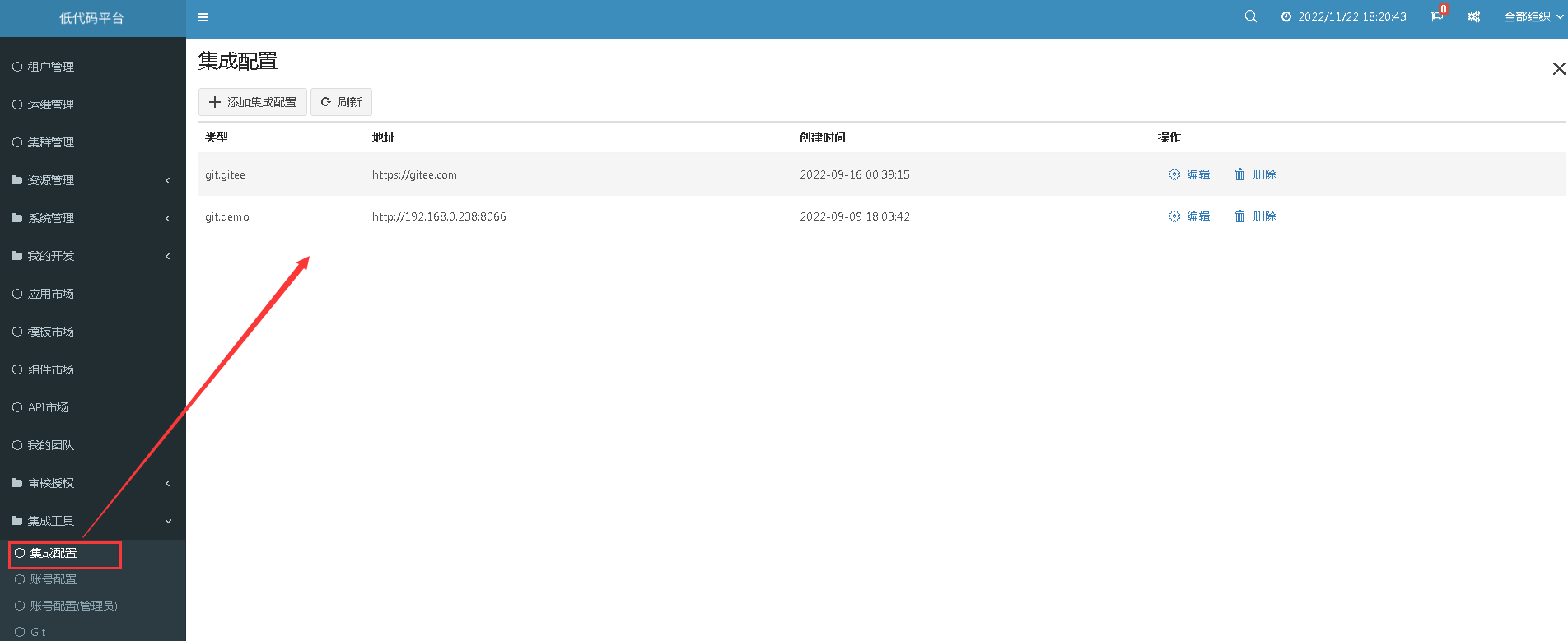 - 添加集成配置外部Git地址:控制台使用system账号登录,在集成配置里添加外部Git地址