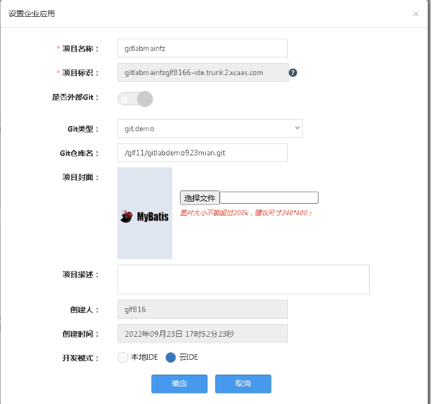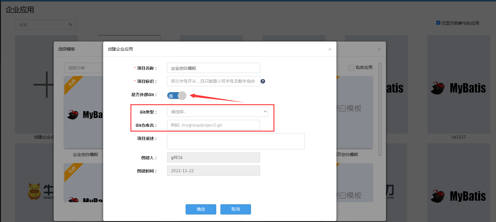 - 创建应用开启外部Git选项,设置Git类型及Git仓库名