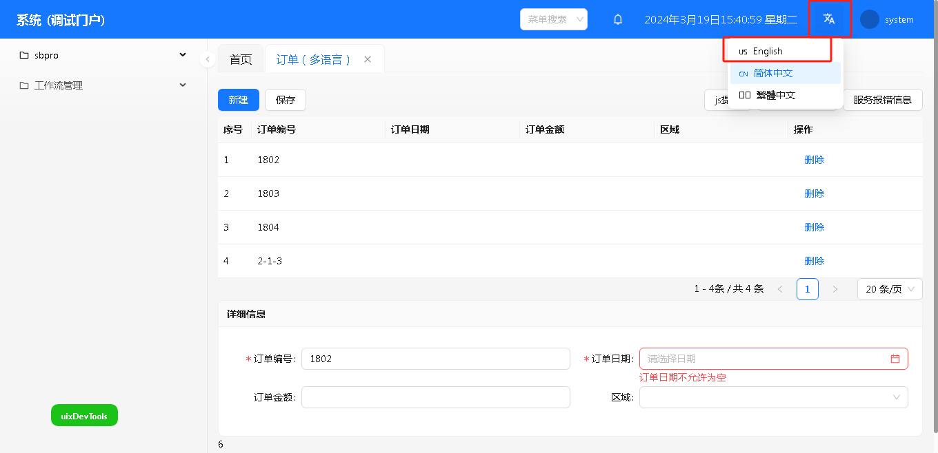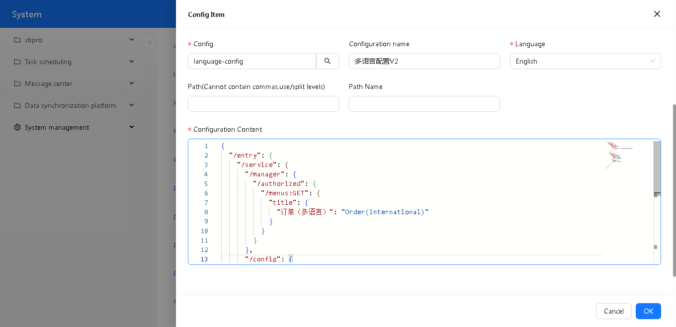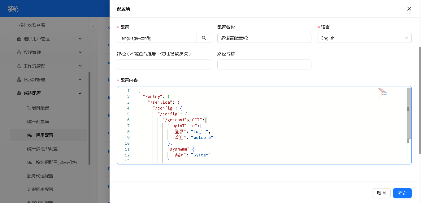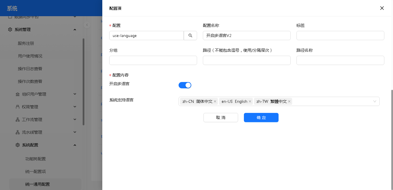 上面配置的内容都是页面内的语言资源,对于显示到门户功能树上的菜单的语言资源,需要在统一通用配置中的多语言配置中配置,如下图所示。