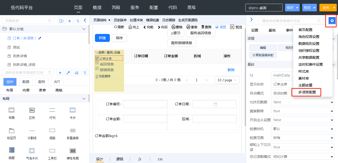 在ide中,点击右上角的齿轮图标,弹出下拉菜单。点击多语言配置菜单,打开多语言配置对话框。