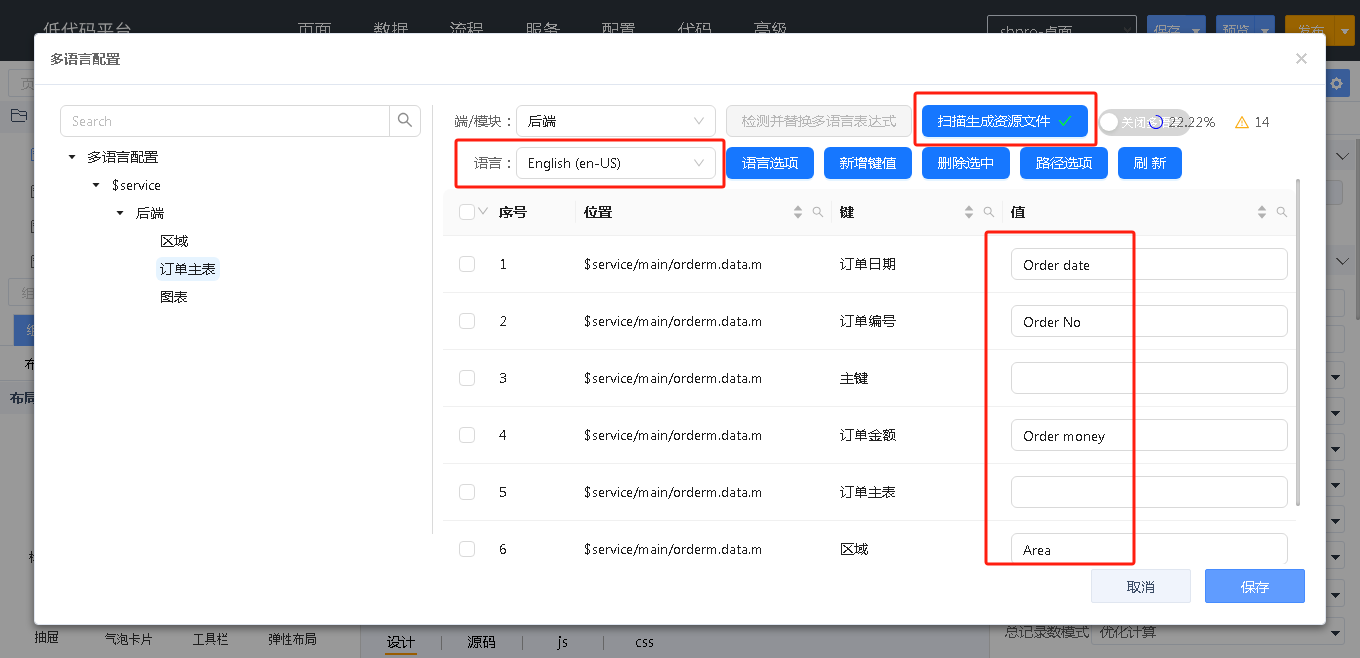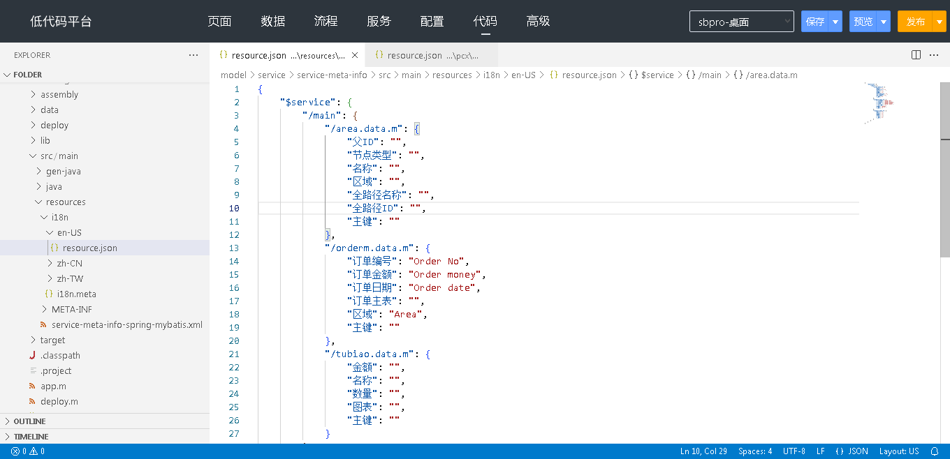 每个端每种语言对应一个资源文件,后端生成的语言资源文件为service/service-meta-info/src/main/resources/i18n/语言/resource.json