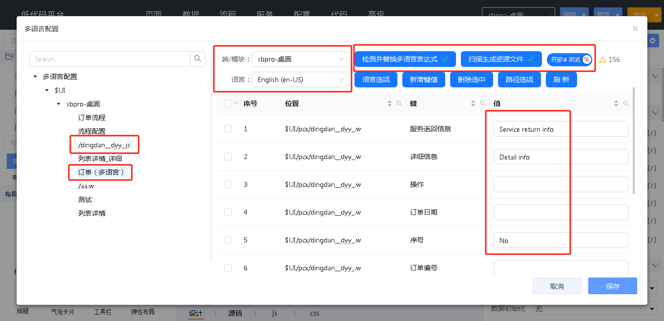 • 系统检查w文件时,对其中可作为语言资源的内容,增加多语言函数,例如text="操作"被替换为text="{$page.i18n('操作')}"