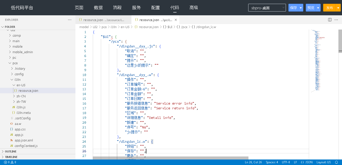 每个端每种语言对应一个资源文件,桌面端生成的语言资源文件为UI2/pcx/i18n/语言/resource.json