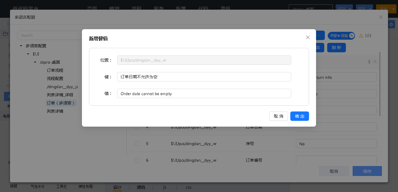 可以通过点击新建键值按钮,添加新的键值。例如数据集的必填提示和约束提示,就需要手工添加相应的语言资源。