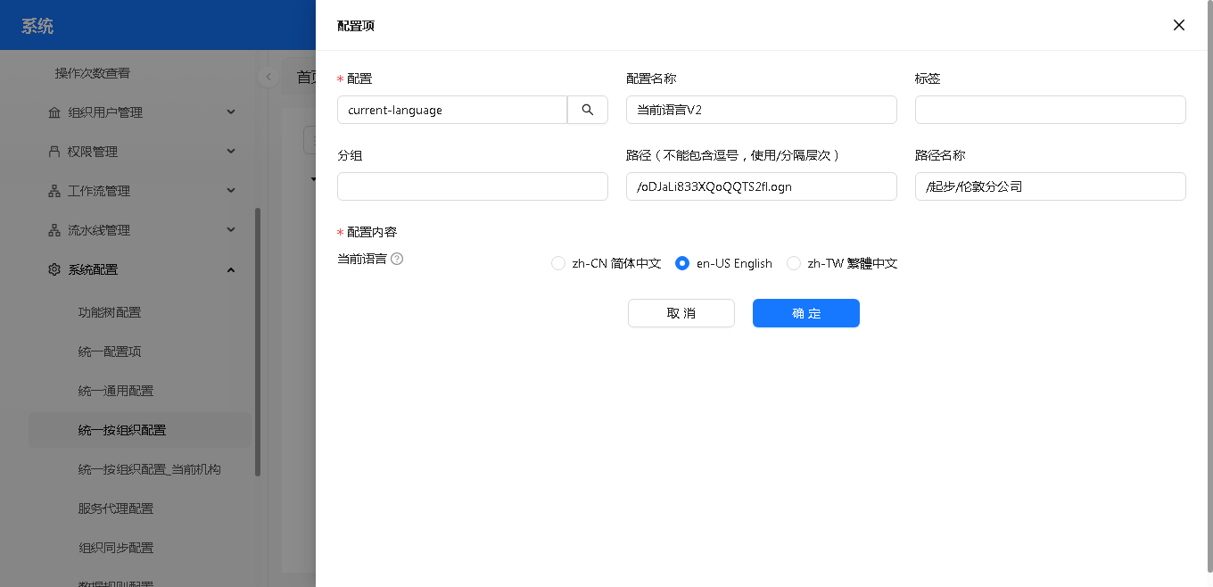• 当前语言:打开统一按组织配置,可以按组织设置当前语言