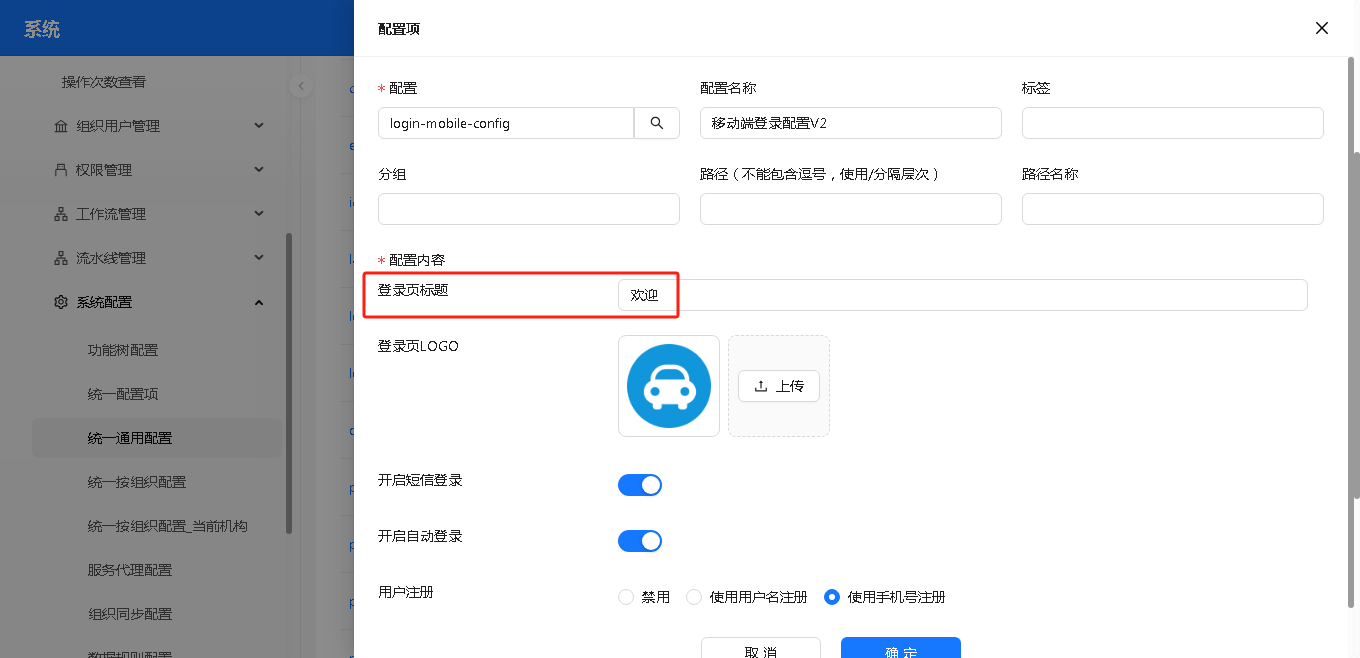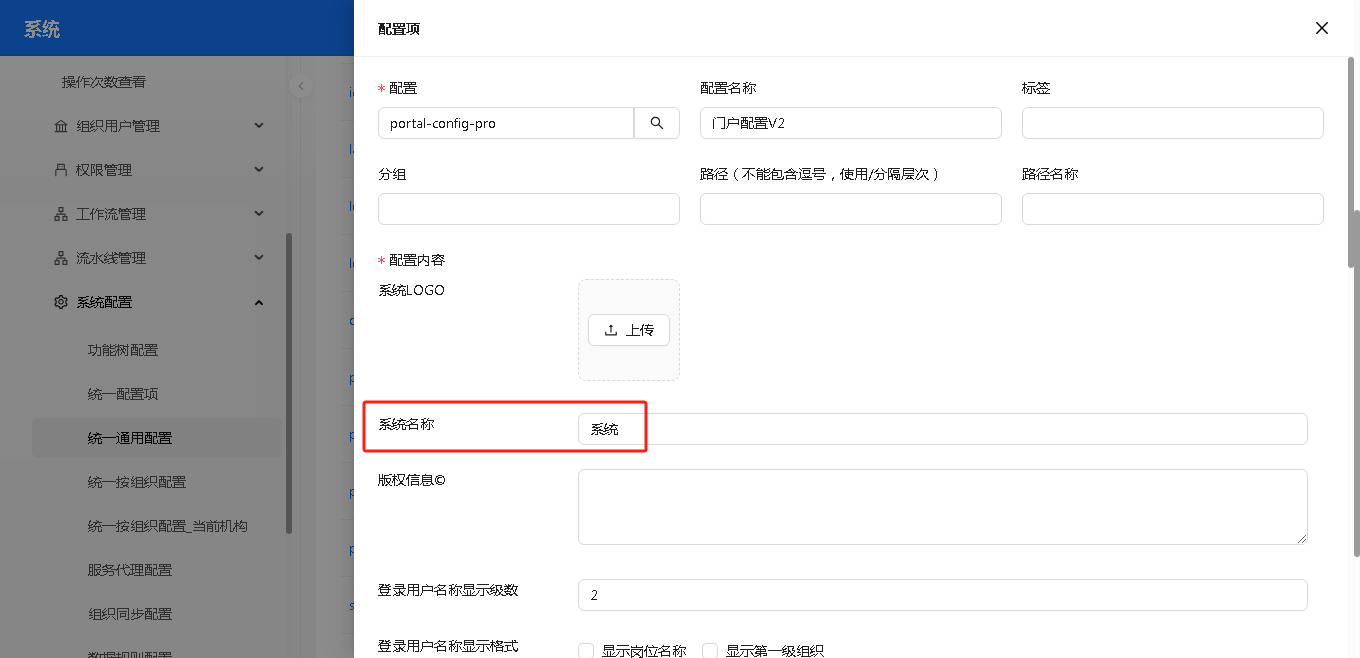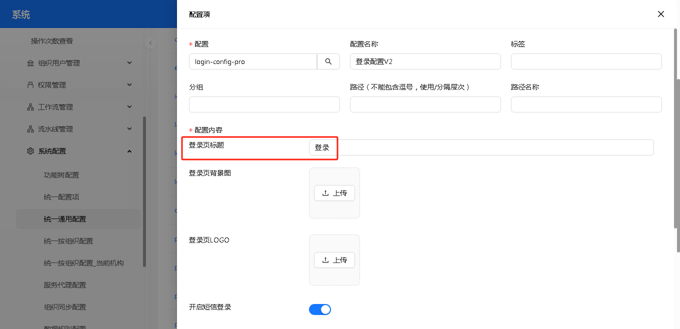 打开统一通用配置,先设置系统名称和登录页标题,再设置语言资源。