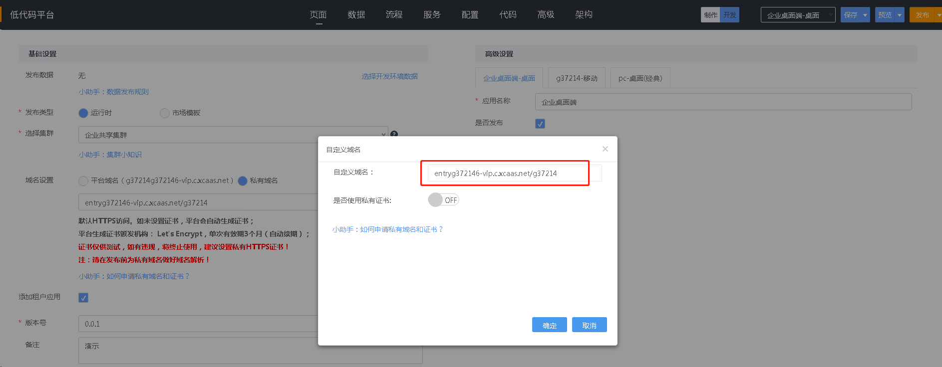 发布时,选择私有域名,自定义域名规则为:门户域名/应用标识