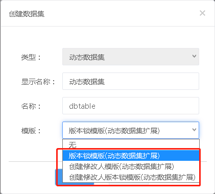 平台默认带了三个模版,选择后就会在动态数据集中生成相关的字段,如下选择的创建修改人版本锁模版
