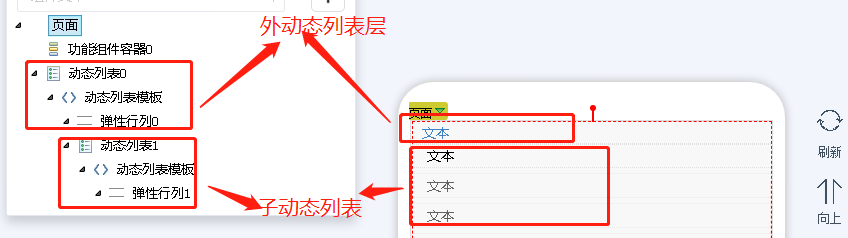 2.在1中添加的动态列表的“动态列表模版”中再添加动态列表(子动态列表),设置其需要绑定的数据集,在其动态列表模版中布局需要的显示组件进行内容的展现