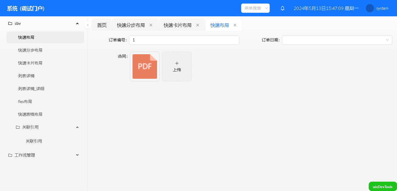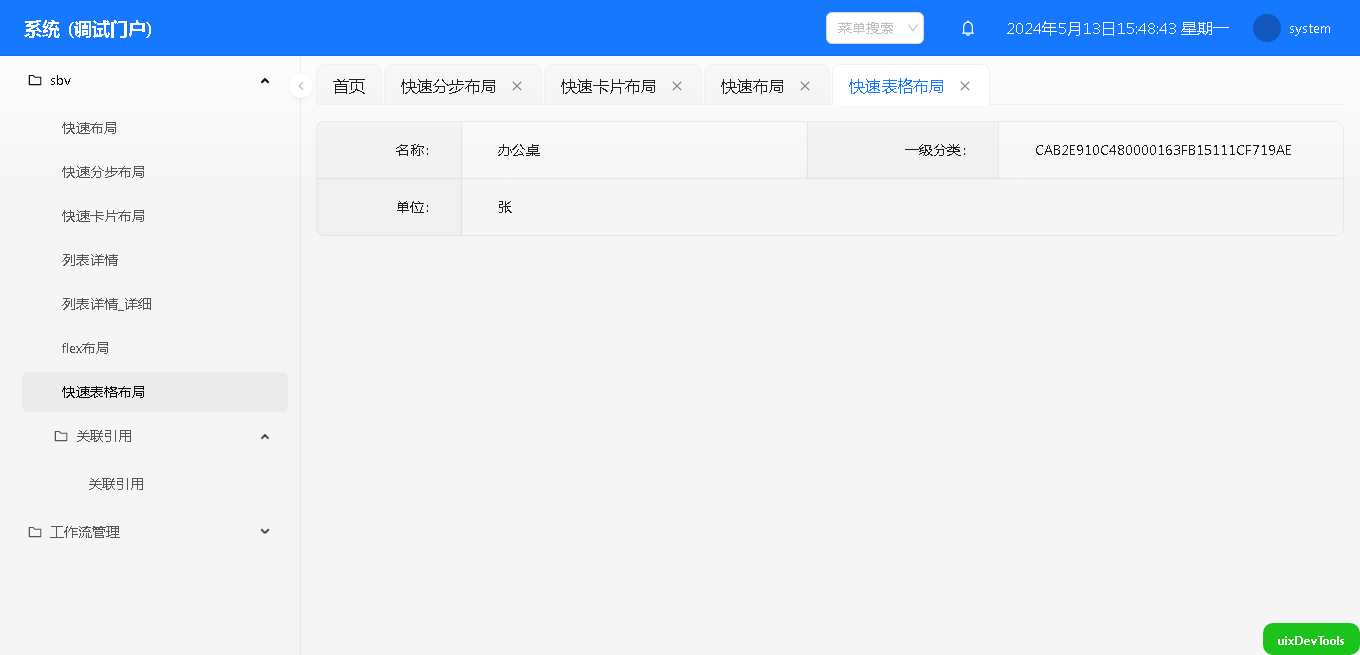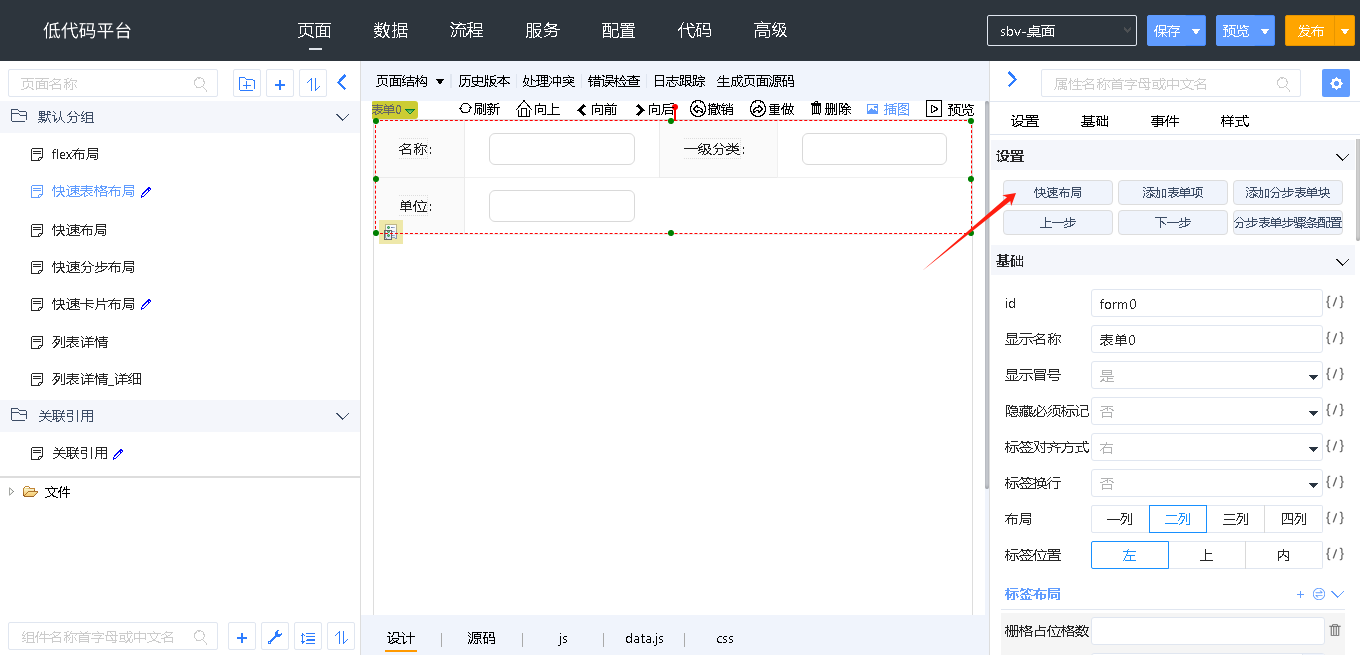 选中“表单”组件,点击“快速布局”,如下图所示,打开快速布局配置页面