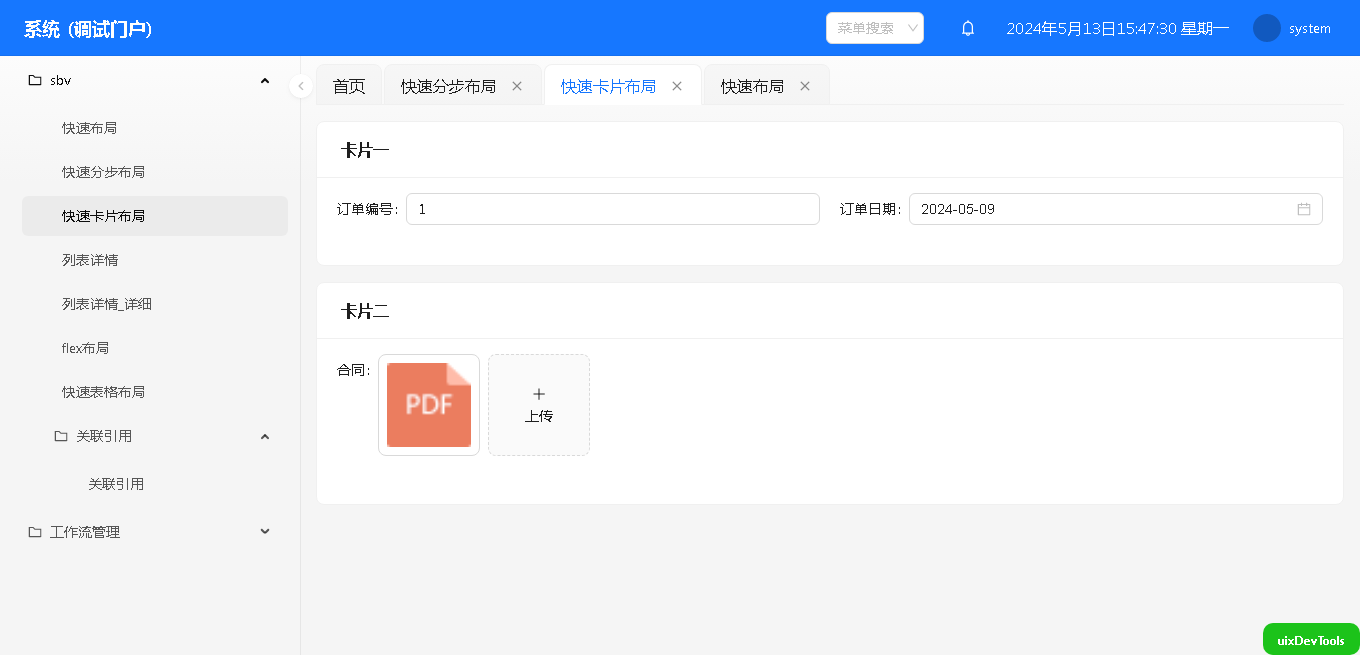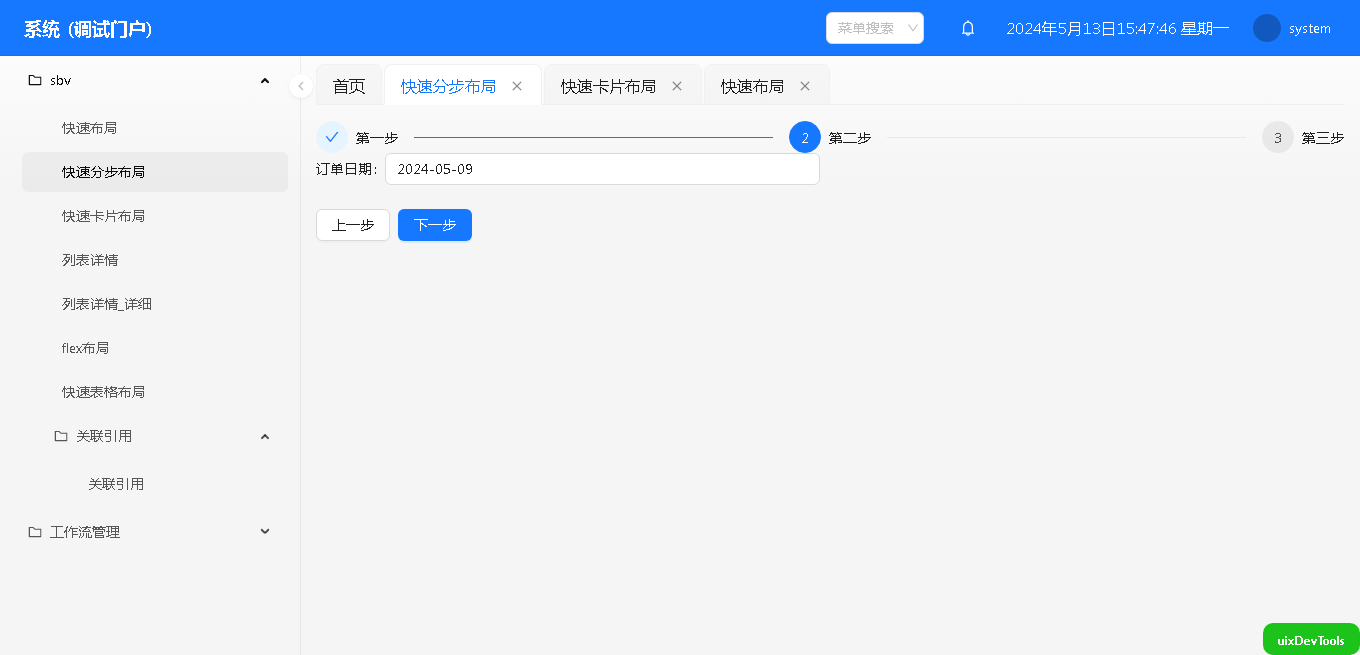 空表单可以设置是否使用分步表单、卡片表单、表格表单,生成表单后不能再修改。 快速布局配置页面中有3个开关:使用分步表单、使用卡片、使用表格布局,如下图所示,选中表示使用,取消选中表示不使用
