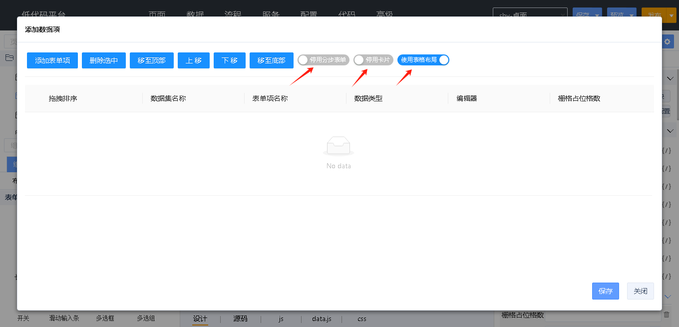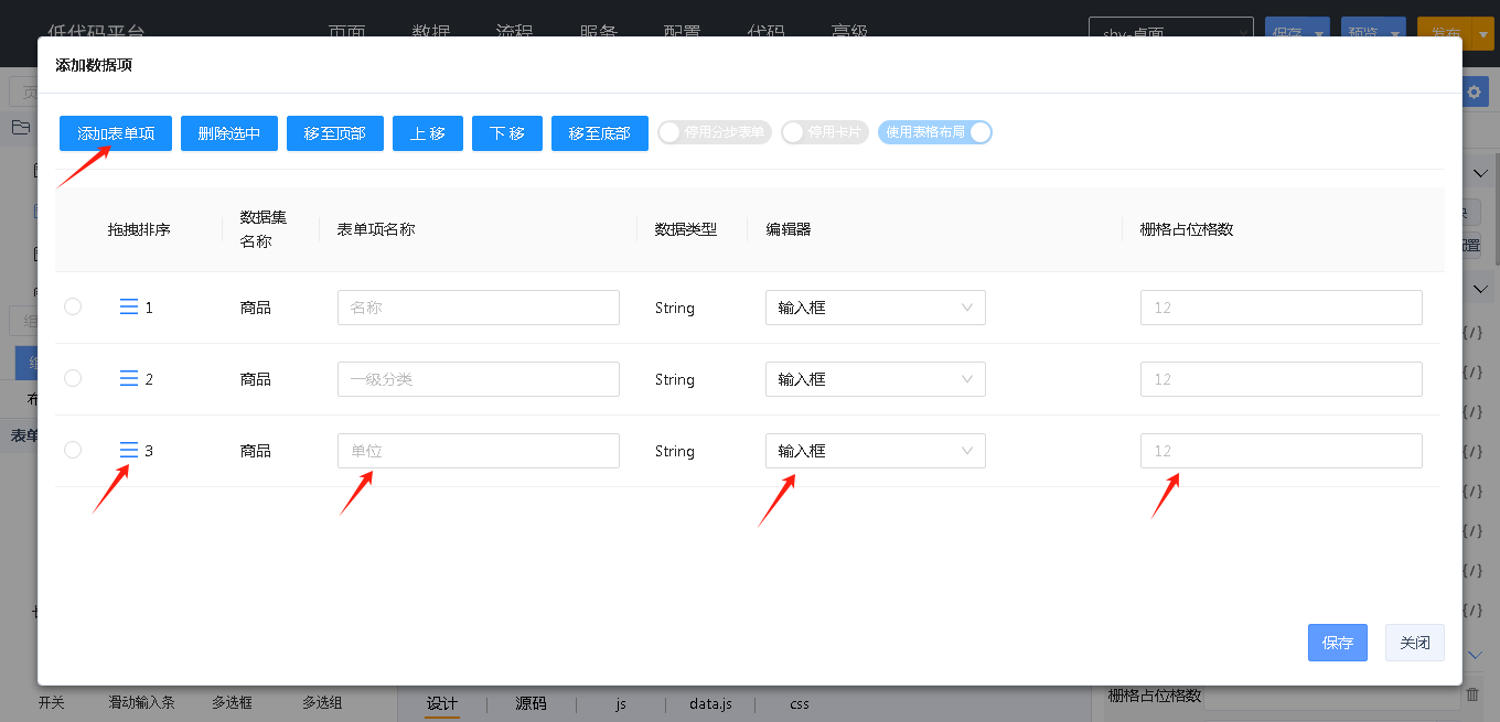 将页面上数据组件中的列添加为表单项,表单项配置如下