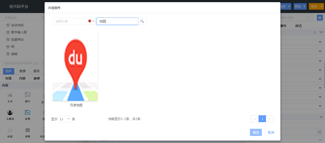 在页面设计区,点击+按钮,弹出市场组件对话框,选择百度地图组件,点引用按钮,再点确定按钮,从市场上下载百度地图组件。