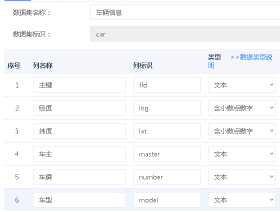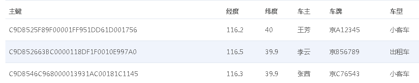 例如我们要在地图上显示车辆标记点,每辆车需要有经度、纬度信息,参考下面的数据集车辆信息