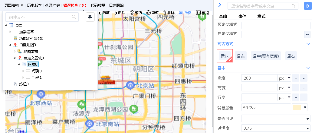 在自定义区域中可以先放一个区块,设置宽度背景色及透明度。在区块中再添加其他显示组件。