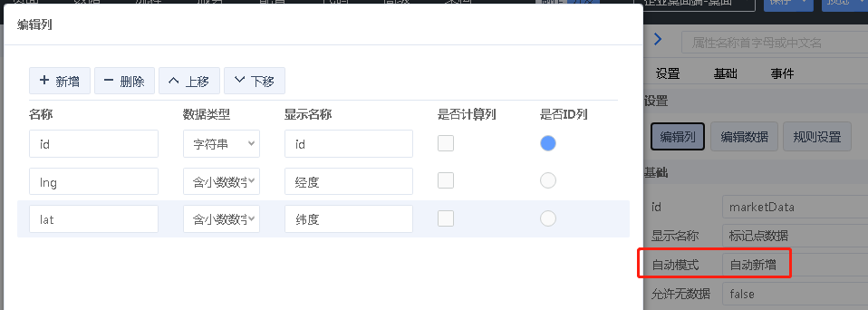在页面上添加一个标记点数据,用来记录当前标记点的经纬度,控制弹出窗口的显示位置,注意自动模式设置为自动新增。