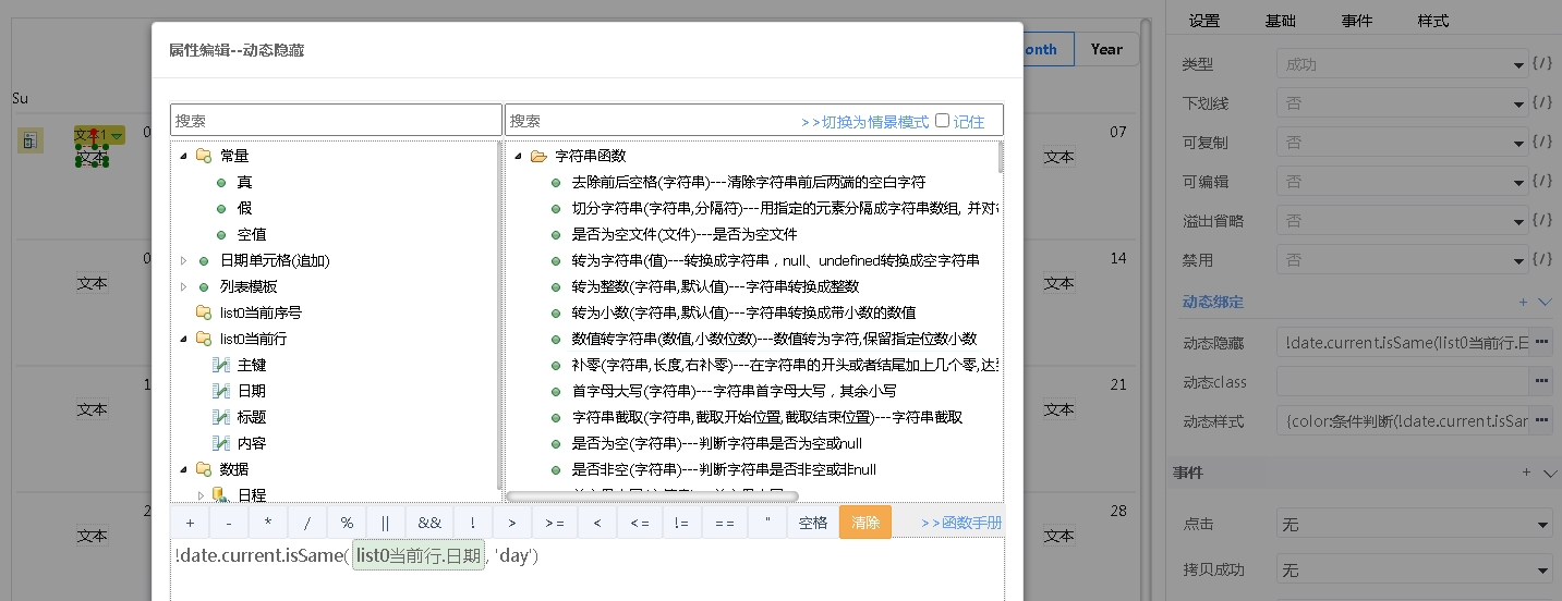 4.列表组件默认是列表格式展现数据集中加载的数据,但日程要显示的是跟单元格日期相同的数据记录,因此需要对展现组件(本例是文本组件)控制动态隐藏。可以用列表组件的当前行存储日期的字段值跟日历组件单元格的日期进去对比,当两个值不相等的时候就隐藏文本不显示,需要注意的是Day.js的isSame函数判断,如图: