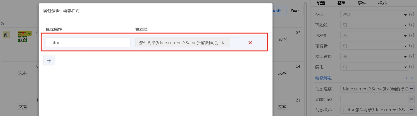 还可以通过动态样式控制当前日期的内容样式,如控制当前日期的内容字体为红色,其他日期的为蓝色;跟动态隐藏的判断条件类似只是把前面的日期改为获取当前日期进行判断,如图: