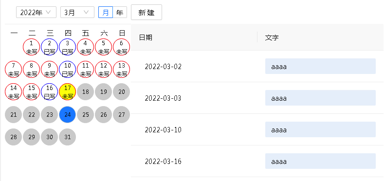 let caption = row ? "已写" : "未写"; // 在日期下面显示的文字