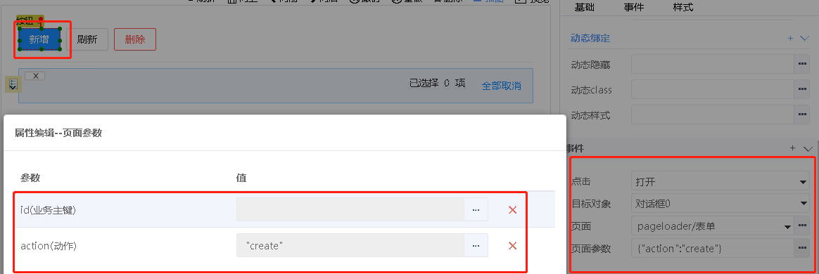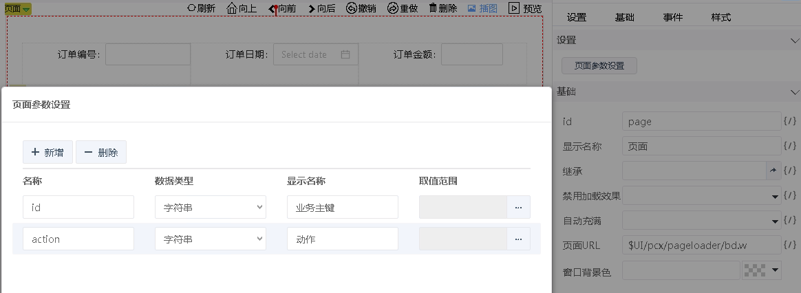 页面加载组件自动添加两个页面参数id和action