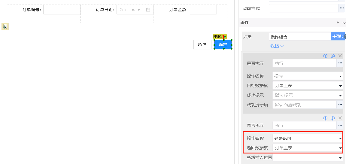 - 在表单页面使用确定返回操作,将数据集返回给列表页面,实现步骤4