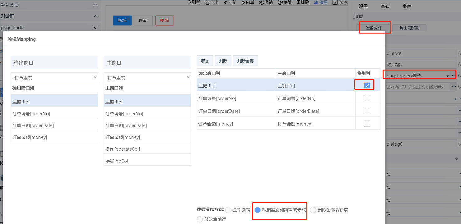 在列表页面中添加对话框组件,设置页面文件为表单页面。点设置数据映射按钮,如下图所示,添加表单页面和列表页面数据集列的对应关系,选中根据鉴别列新增或修改,并设置主键列为鉴别列,用于接收数据时判断数据是否存在,如果不存在则新增,否则修改对应的数据。