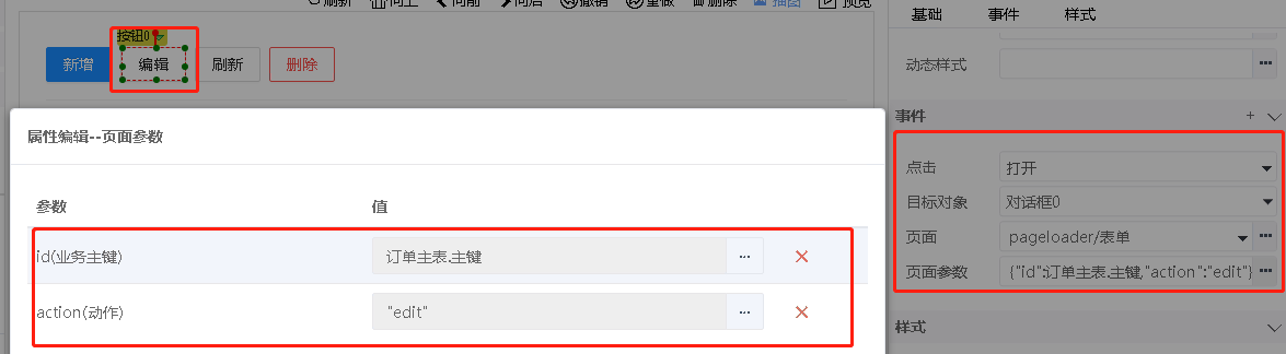 调用对话框的打开操作,编辑时action传入edit,如果编辑按钮在表格外,表示编辑数据集的当前行数据,id选择数据集的主键列;如果在表格内,表示编辑表格的当前行数据,id选择表格当前行的主键列,参考查看按钮的设置。