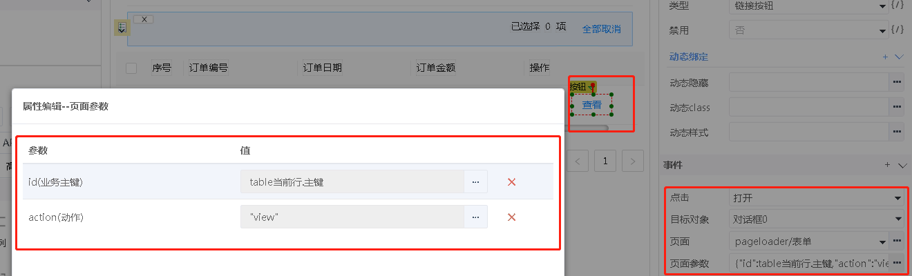调用对话框的打开操作,查看时action传入view,查看按钮在表格内,id选择表格当前行的主键列。