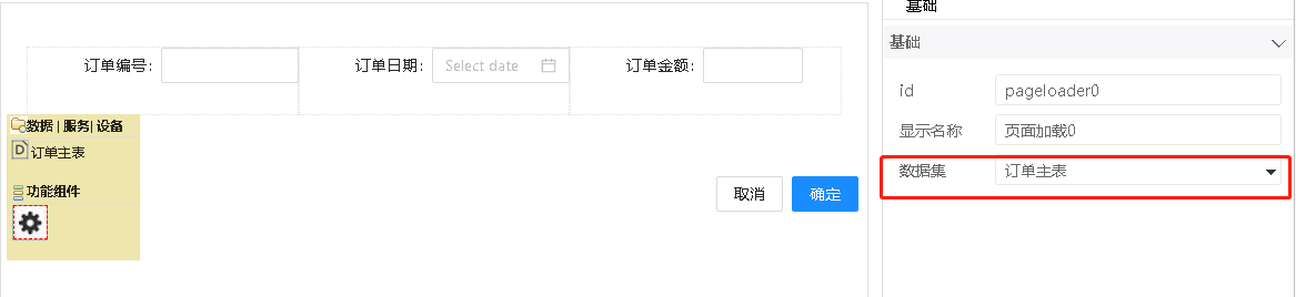 在表单页面中添加页面加载组件,并设置数据集属性