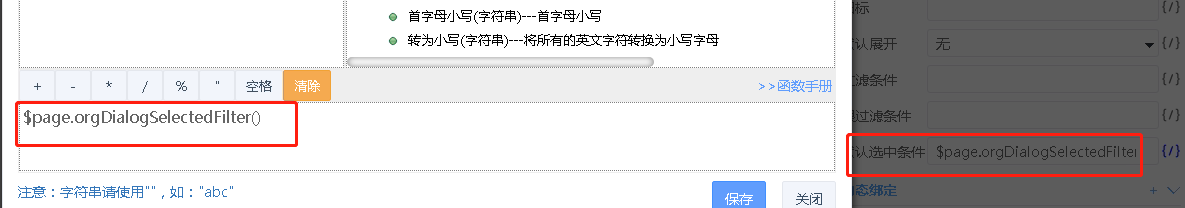 默认选中条件设置时可以是json串或者json数组,需要在js中定义函数,然后在“默认选择条件”,属性上调用函数如下: