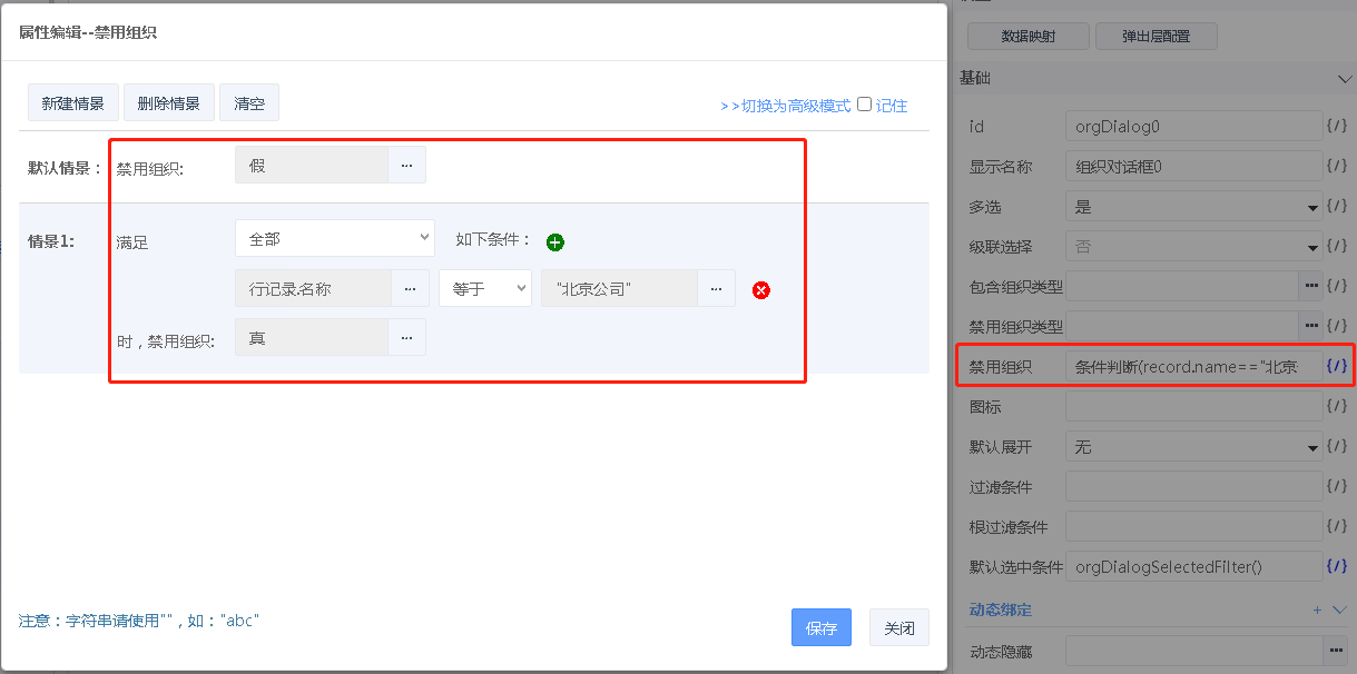 通过属性设置禁用组织和禁用组织类型时也可以通过其他数据集的数据设置情景判断实现动态变化
