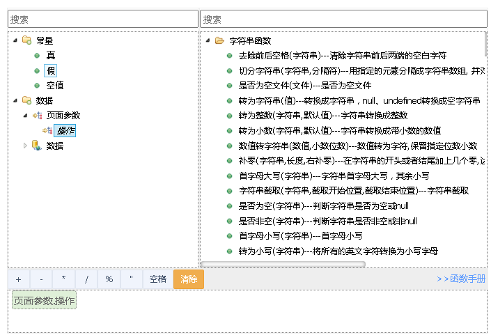 定义了页面参数后,在表达式编辑器中的数据里面会出现页面参数,下面是定义的参数,如下图所示