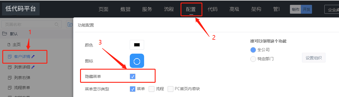 如果被打开的页面不需要在功能树上显示,需要在配置中设置为隐藏