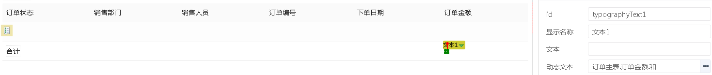 3.在需要显示内容的列中放入组件设置内容即可,如下,第一列放文本组件显示合计,最后一列放文本组件显示数据集中列的合计值