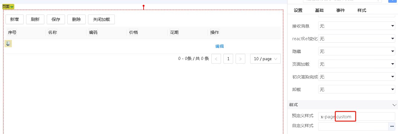 3.然后在页面组件的样式中设置上custom,该custom样式需要设置在table组件的任一祖先组件上,比如案例使用的页面组件,如下: