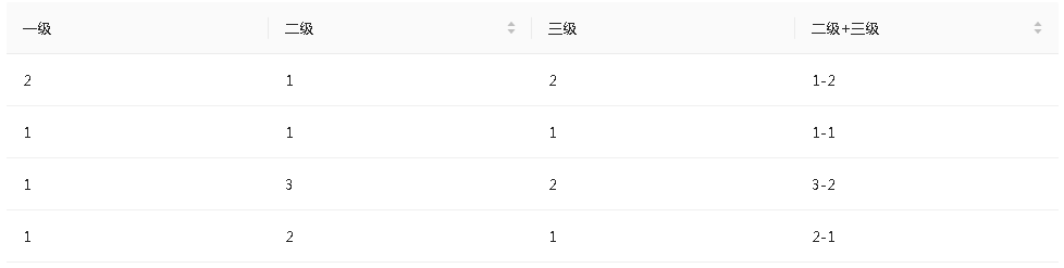 上图表格中的二级+三级是数据集中二级列和三级列组合起来的,表格列定义如下