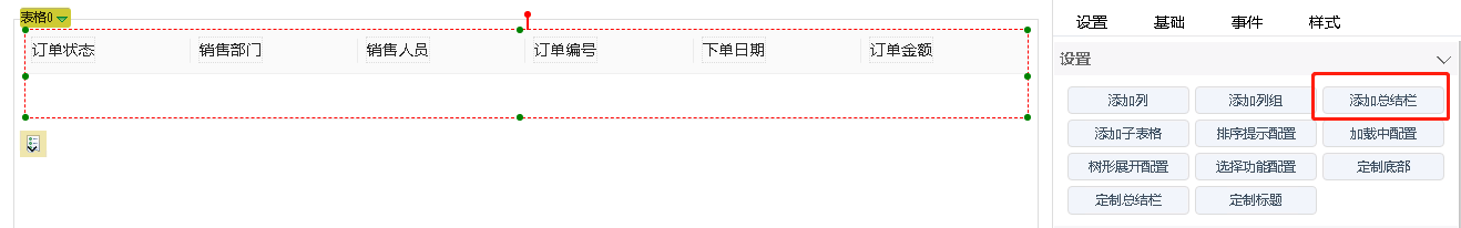 3.在需要显示内容的列中放入组件设置内容即可,如下,第一列放文本组件显示合计,最后一列放文本组件显示数据集中列的合计值
