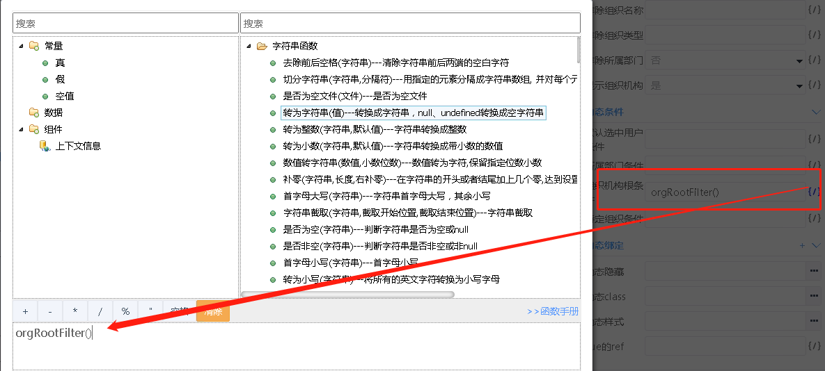 filter需要是json数组,在js中定义函数返回,然后在“组织机构根条件”属性上调用函数如下: