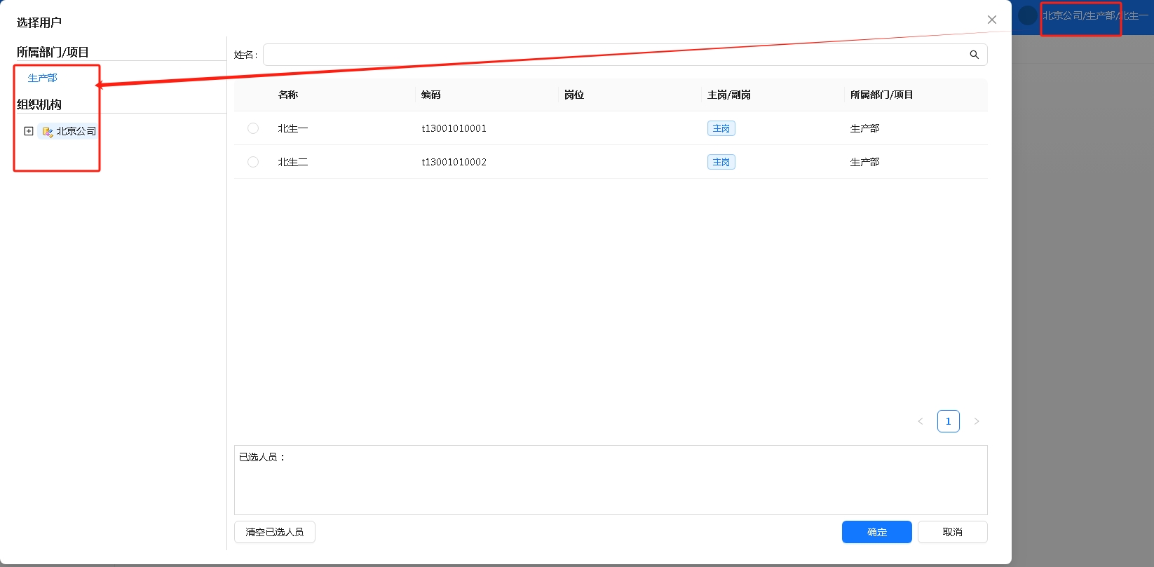 所属部门:人员列表显示的是当前人所在部门下的人员