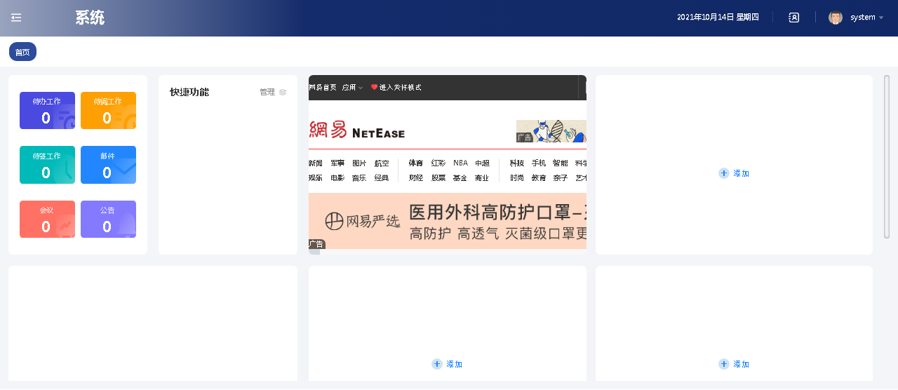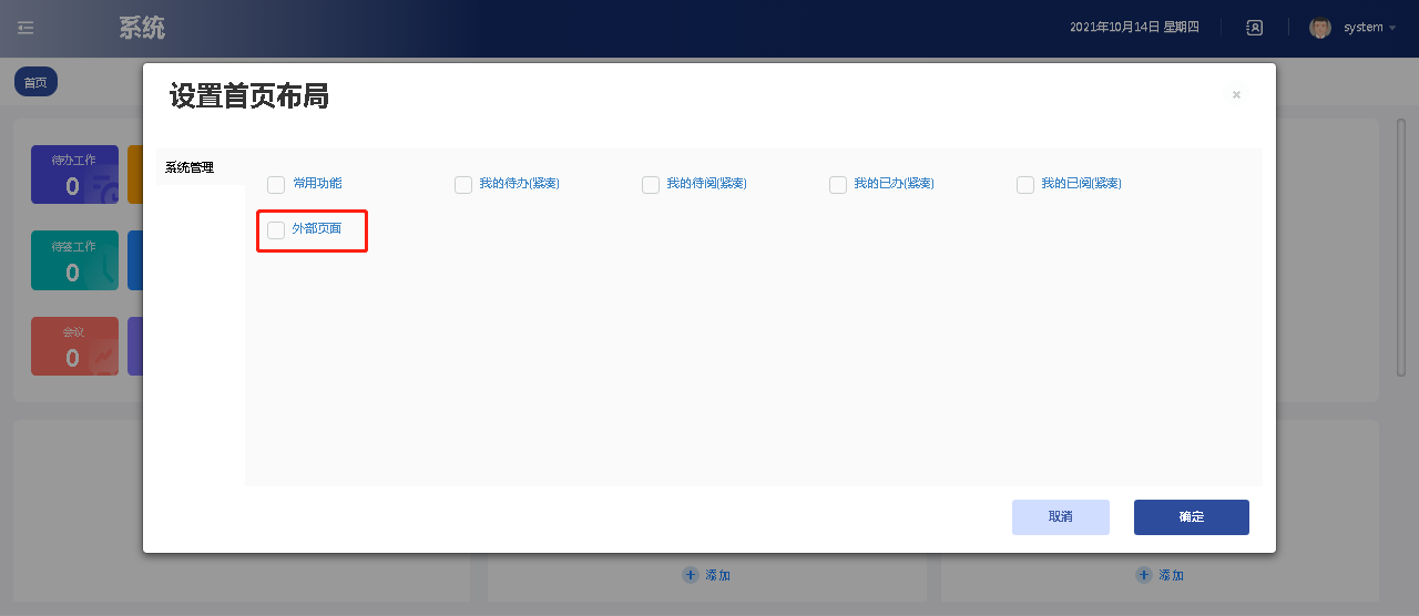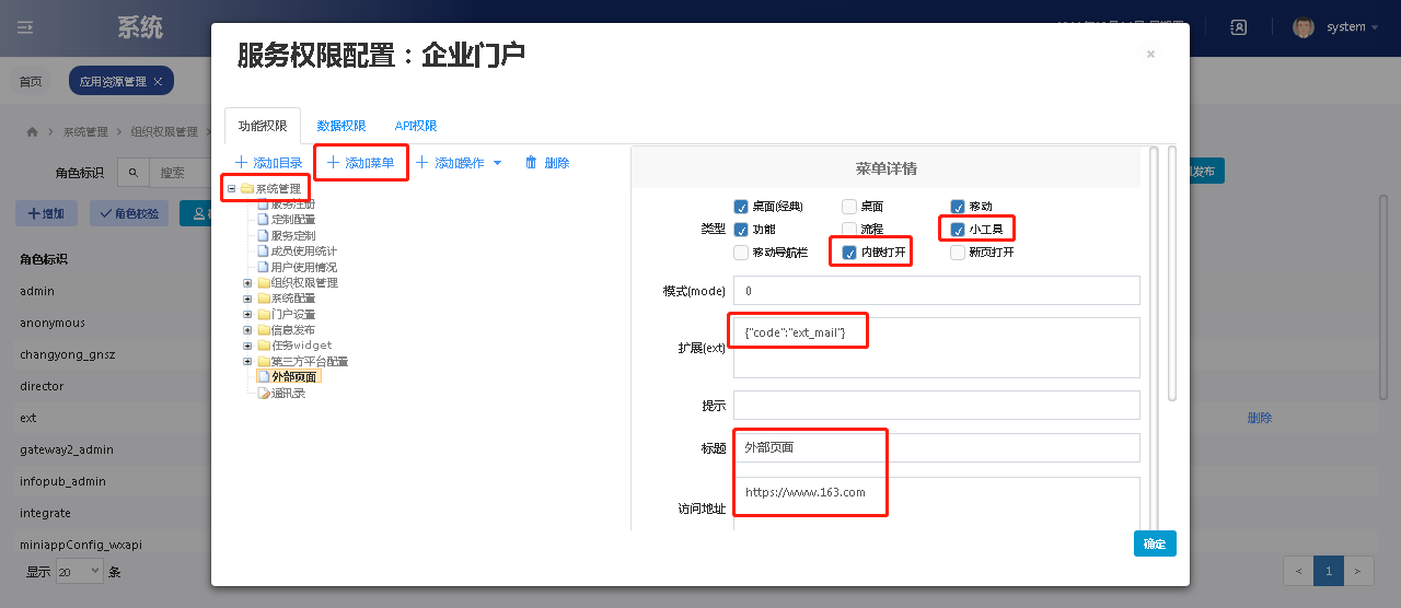 • 在扩展(ext)中输入{"code":"widget编码"},例如{"code":"ext_mail"},注意widget编码必须全局唯一