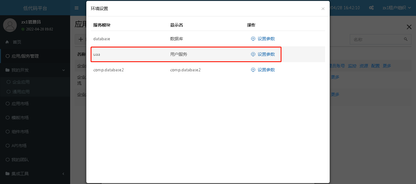 - 点击用户服务右侧的设置参数按钮,打开参数配置对话框