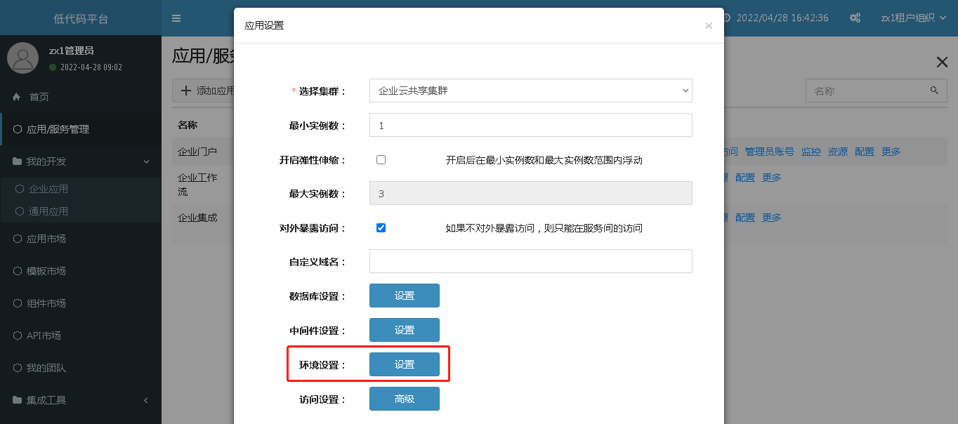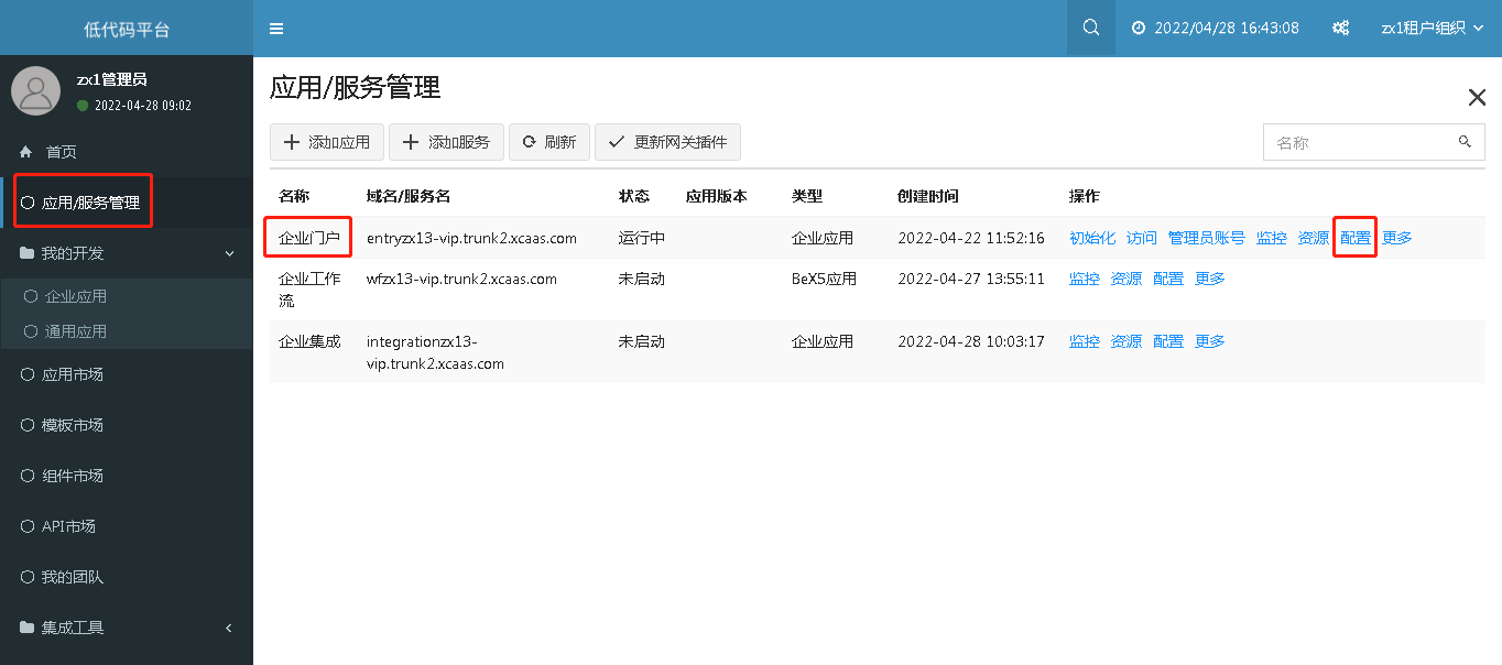 - 使用租户管理员登录控制台,打开应用服务管理页面,点击企业门户右侧的配置按钮,打开配置对话框