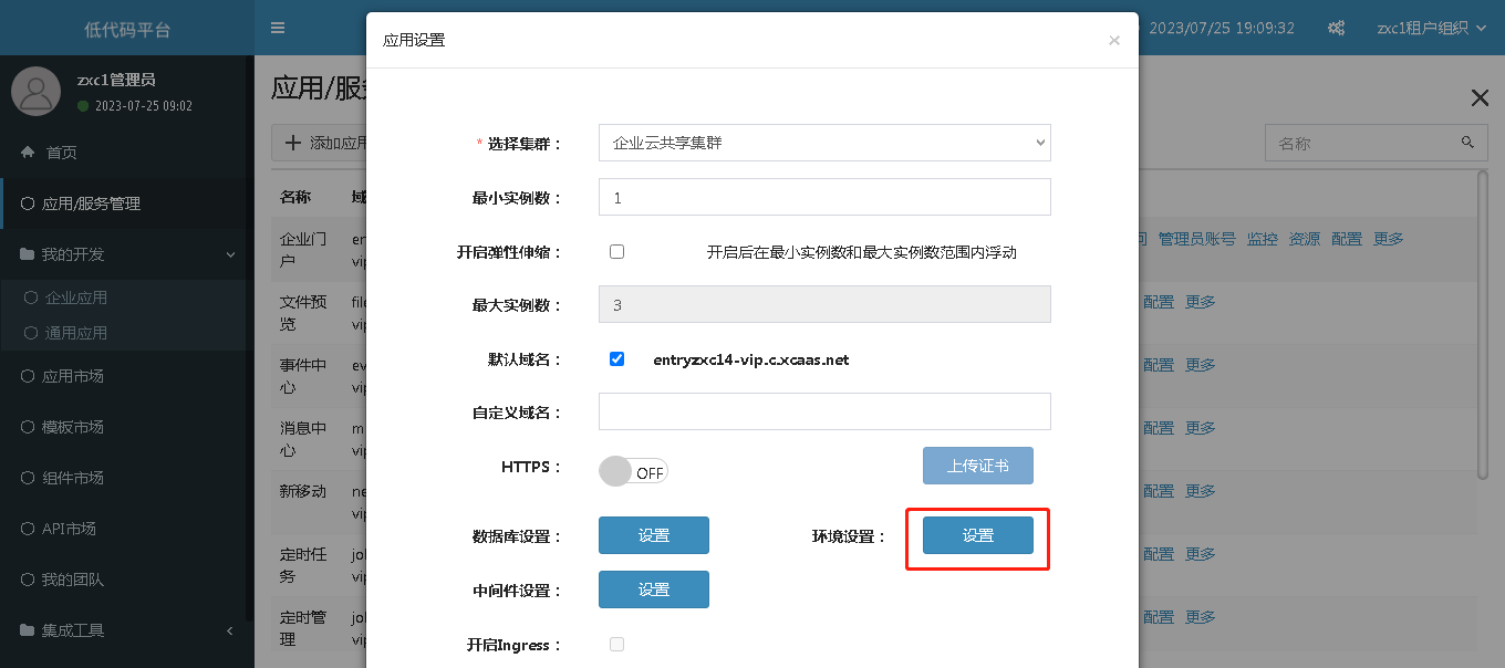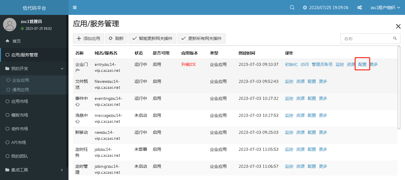 使用租户管理员登录低代码平台,打开应用服务管理,点击企业门户右侧的配置按钮,打开应用设置对话框